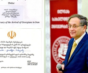 ირანის რევოლუციისადმი მიძღვნილ საზეიმო მიღების მოსაწვევს The 410thy Anniversary of the Arrival of Georgians in Iran აწერია ირანის რევოლუციისადმი მიძღვნილ საზეიმო მიღების მოსაწვევს The 410thy Anniversary of the Arrival of Georgians in Iran აწერია