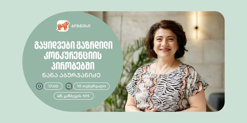 10 თებერვალს, საქართველოს ბანკის ორგანიზებით, გაიმართება ვორკშოპი — გაყიდვები გაზრდილი კონკურენციის პირობებში, რომელსაც ნანა აბურჯანიძე — ბიზნესსაკონსულტაციო კომპანია Solutioneer-ის დამფუძნებელი და დირექტორი გაუძღვება.