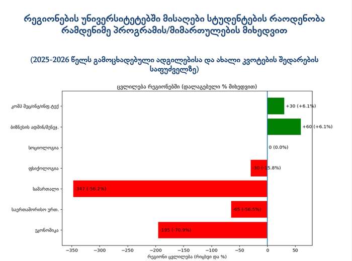 რეგიონებშიც გაზრდილია სტუდენტების მიღება კომპიუტერულ მეცნიერებათა და ბიზნესის მიმართულებებზე, შემცირებულია — ეკონომიკის, სამართლისა და საერთაშორისო ურთიერთობების მიმართულებებზე.