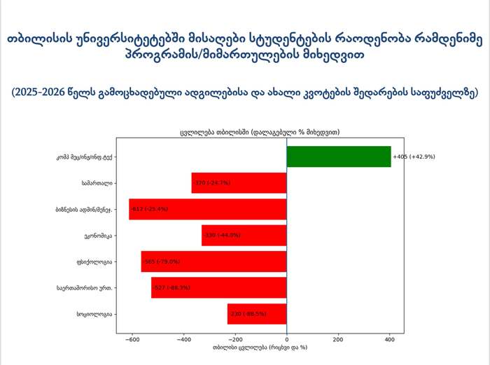 შალვა ტაბატაძის მიერ გამოქვეყნებული ინფოგრაფიკის მიხედვით, თბილისში 42.9%-ითაა გაზრდილი კომპიუტერულ მეცნიერებათა, ინჟინერიის, ინფორმატიკის მიმართულებებზე მისაღები სტუდენტების რაოდენობა. სამაგიეროდ შემცირებულია — სამართლის (24.7%), ბიზნეს-ადმინისტრირების (25.4%), ფსიქოლოგიის (79%), ეკონომიკის (44%), საერთაშორისო ურთიერთობების (88.3%), სოციოლოგიის (88.5%) მიმართულებებზე მისაღები სტუდენტების რაოდენობა.