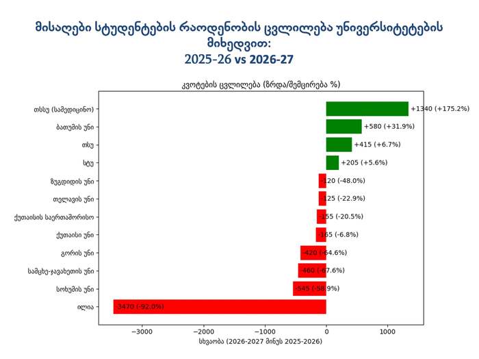 1. 2025-2026 წელთან შედარებით სახელმწიფო უნივერსიტეტებში საბაკალავრო პროგრამებზე მისაღები სტუდენტების რაოდენობა შემცირებულია 3,000 ადგილით;