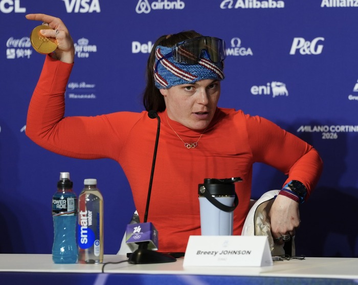 ბრიზი ჯონსონი ზამთრის ოლიმპიადაზე მედიას თავის მედალს აჩვენებს, რომელსაც ლენტი მოწყდა