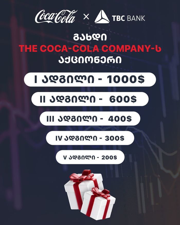 პრიზებს გამარჯვებულები The Coca-Cola Company-ის აქციების სახით, თიბისის მობაილბანკში მიიღებენ — მომხმარებლის საინვესტიციო ანგარიშზე.