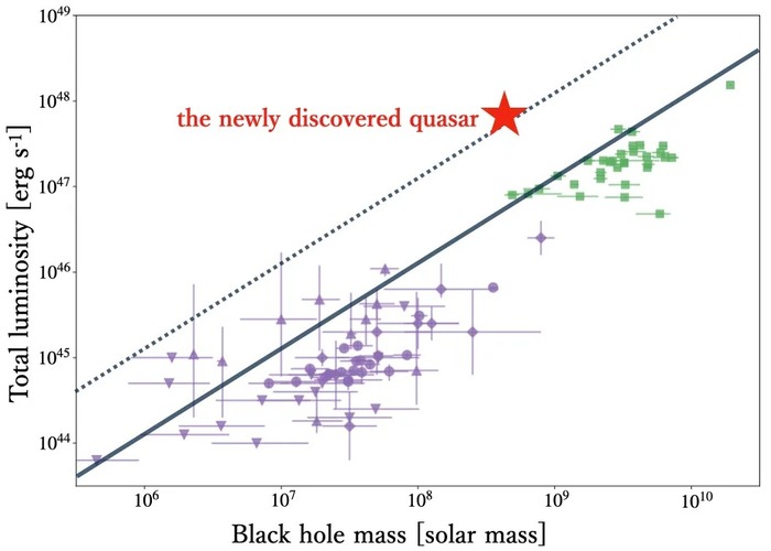 მას ისეთს ვხედავთ, როგორიც 12 მილიარდი წლის წინ იყო, როცა 440 მილიონი მზის მასა ჰქონდა. გამოდის, რომ ის ჩვენი გალაქტიკის ცენტრალურ შავ ხვრელზე, მშვილდოსან A*-ზე, 100-ზე მეტჯერ მასიურია.