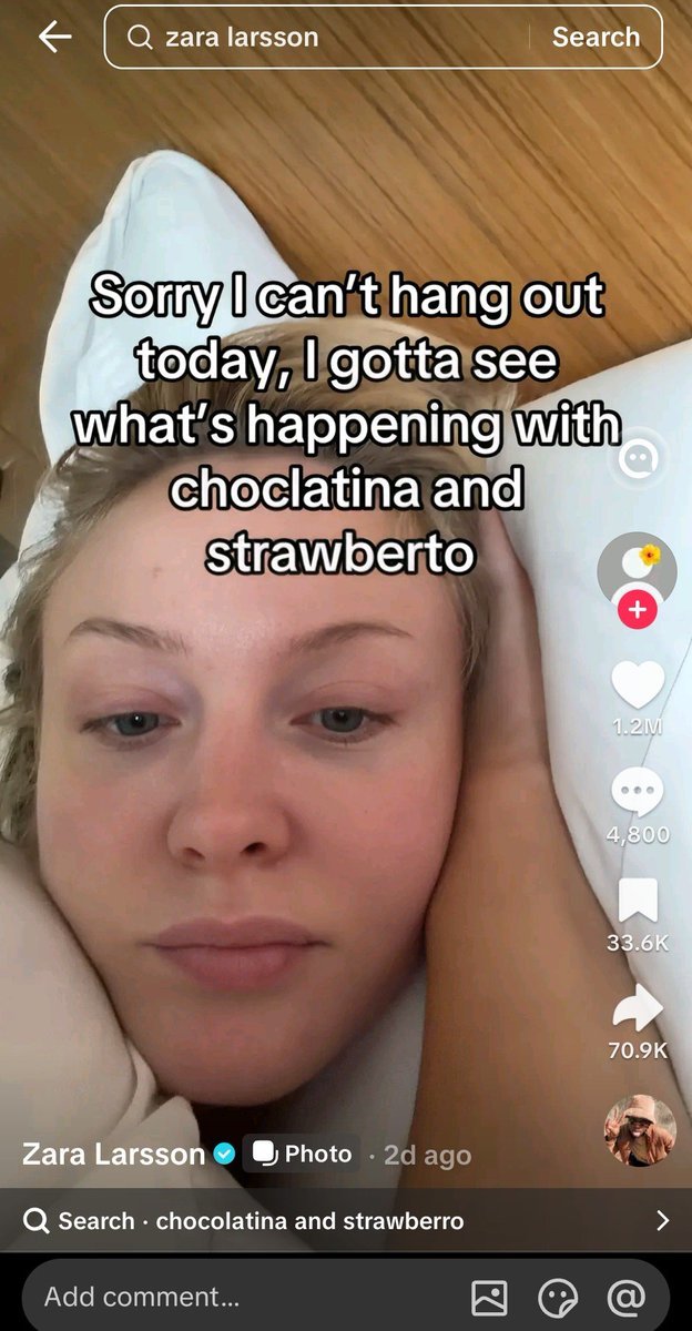 AI ვიდეოებმა მომხმარებლების ნაწილში აღფრთოვანება, მეორე ნაწილში კი — ბრაზი გამოიწვია. ამ მომხმარებლებს შორის არამხოლოდ რიგითი ანონიმური პირები, არამედ ცნობილი ადამიანებიც შედიან — პოპვარსკვლავმა ზარა ლარსონმა TikTok-ზე გამოაქვეყნა პოსტი (რომელიც კრიტიკის ტალღის შემდეგ წაშალა) წარწერით: "ბოდიში, დღეს ვერ გამოვალ, უნდა ვნახო, რა ხდება ჩოკოლატინასა და სტრობერტოს თავს".