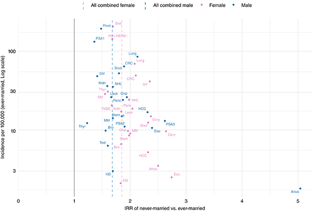 კაცებში ყველაზე დიდი განსხვავება შესამჩნევი იყო ანუსის კიბოს სტატისტიკაში (დაახლოებით ხუთჯერ მეტი სიხშირე დაუქორწინებელ კაცებში, ვიდრე დაქორწინებულებში) და საშვილოსნოს ყელის კიბოს მხრივ ქალებში (თითქმის სამჯერ მეტი მაჩვენებელი დაუქორწინებელ ქალებში, ვიდრე დაქორწინებულ ქალებში).
