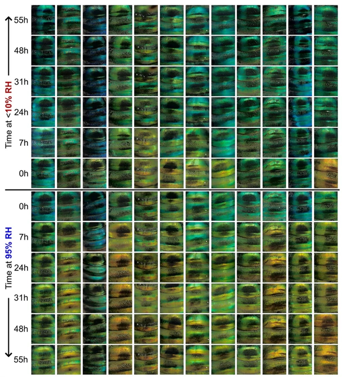 ყველაზე შესამჩნევი ცვლილება პირველი 24 საათის განმავლობაში დაფიქსირდა; ჩვეულებრივი ტენიანობის პირობებში ფუტკრების დამცავი გარსის ფერი საშუალო ტონალობის მწვანე იყო, ტენიანობის მატების შემდეგ კი მომწვანო სტაფილოსფერი გახდა. რაც შეეხება დაბალ ტენიანობას, ამ დროს იგი მოლურჯო მწვანე იყო.