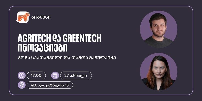 27 აპრილს, 17:00 საათზე, ბიზნეს 360˚-ის შეხვედრების სერიის ფარგლებში, საქართველოს ბანკის ორგანიზებით, ბიზნესის წარმომადგენლებისა და დაინტერესებულ პირებისთვის ვორქშოპი — AgriTech და GreenTech ინოვაციები გაიმართება. შეხვედრას თამთა მამულაიძე და გოგა საათაშვილი გაუძღვებიან.
