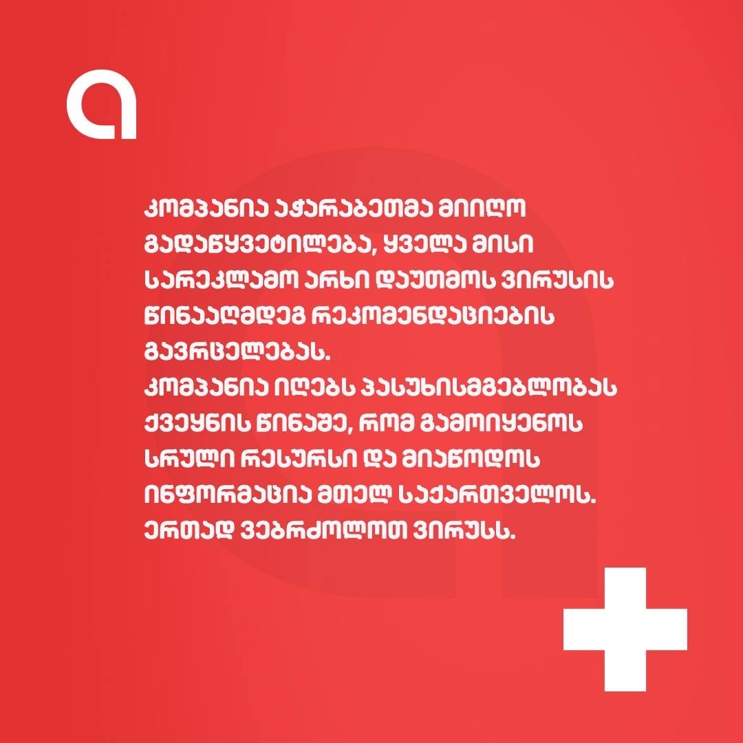 აჭარაბეთმა ყველა სარეკლამო სივრცე კორონავირუსთან დაკავშირებულ რეკომენდაციებს დაუთმო. ამის შესახებ ინფორმაციას კომპანია ავრცელებს. მათივე ცნობით, მათ ხელთ არსებულ ყველა სარეკლამო არხში კორონავირუსთან დაკავშირებული რეკომენდაციების შესახებ ინფორმაციაც განათვსდა.